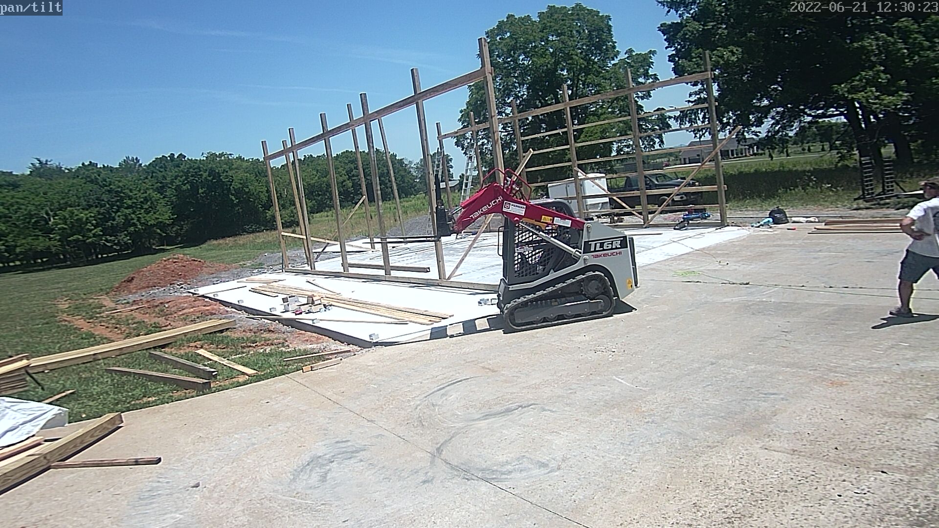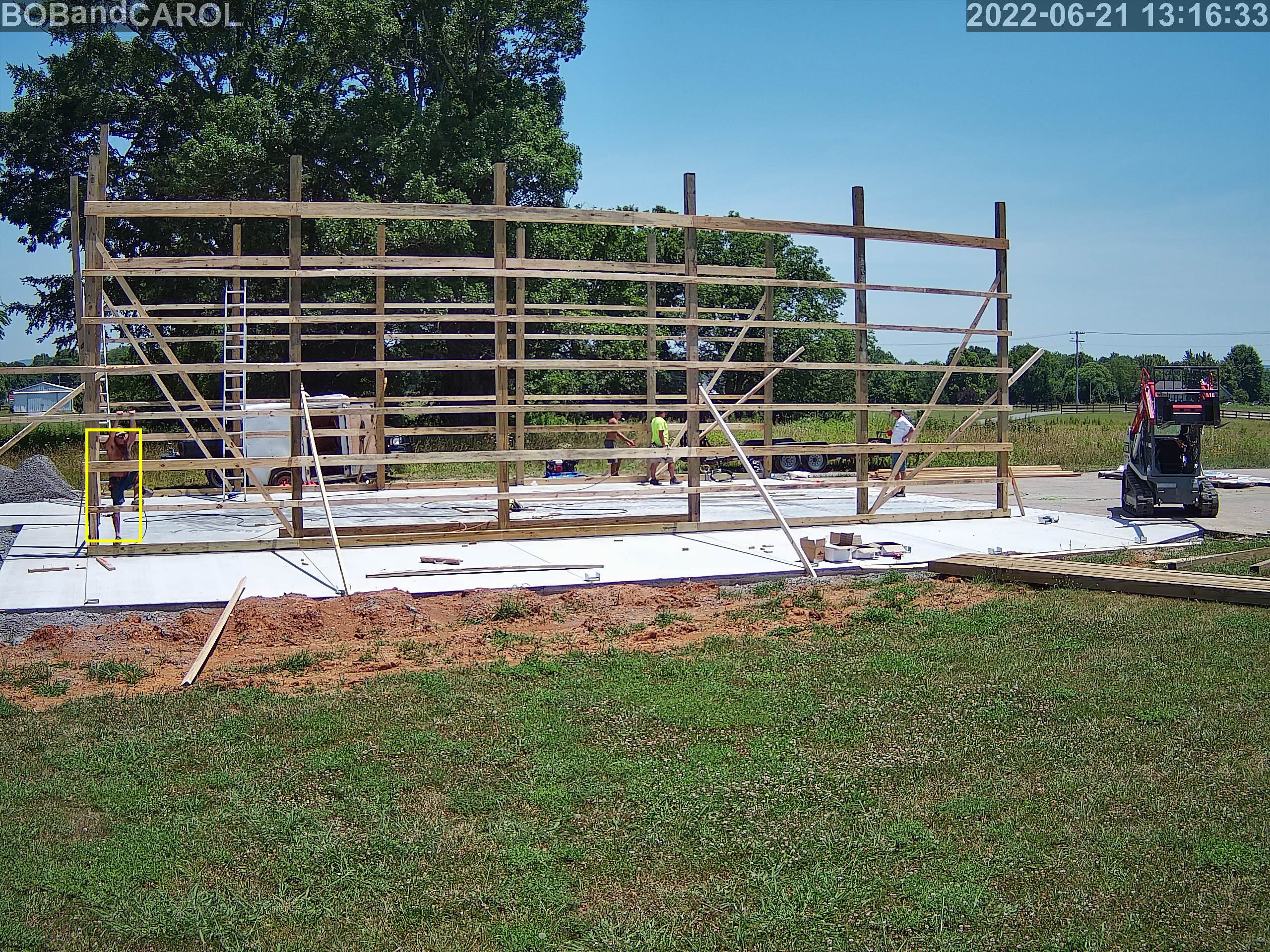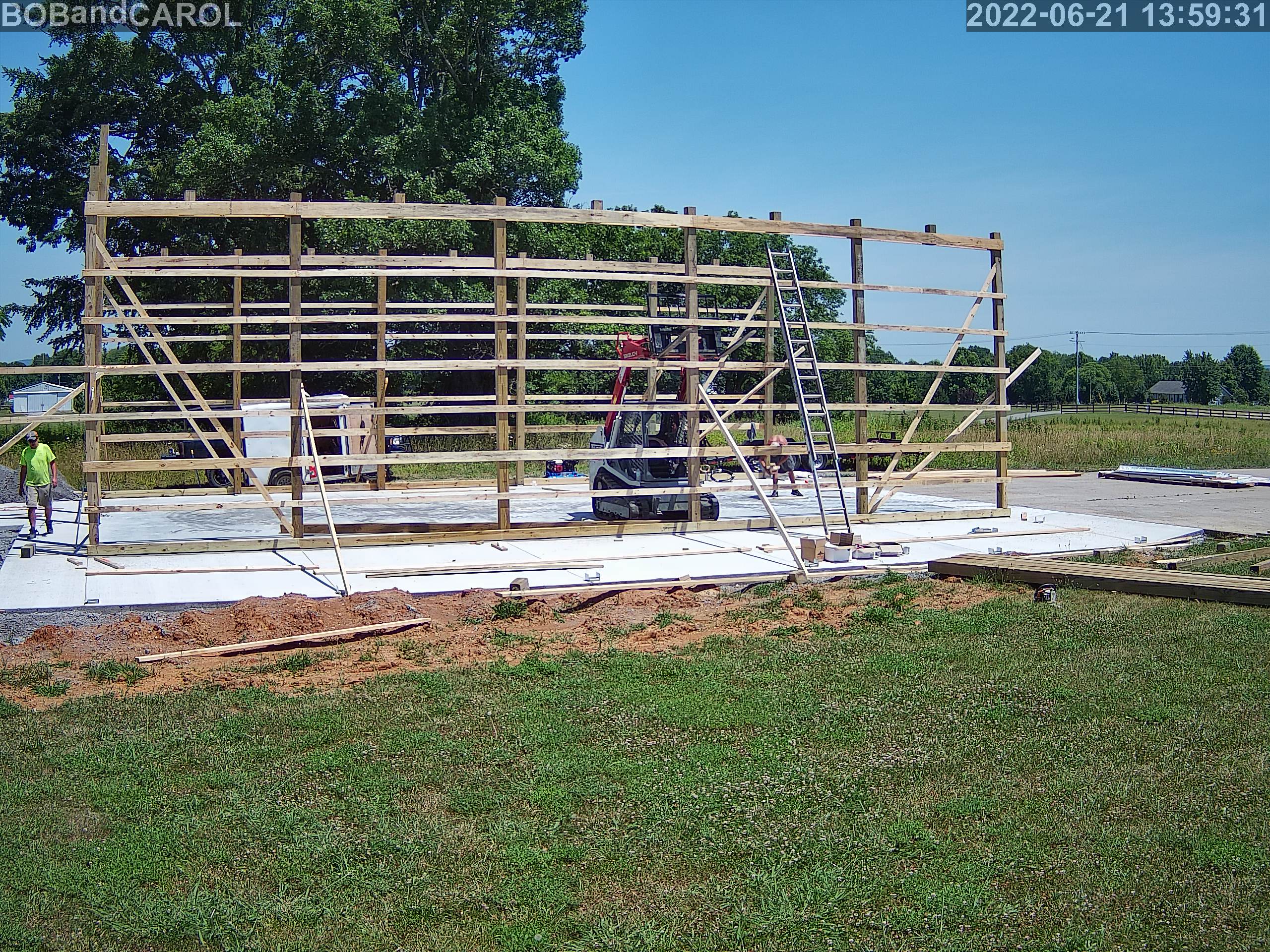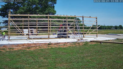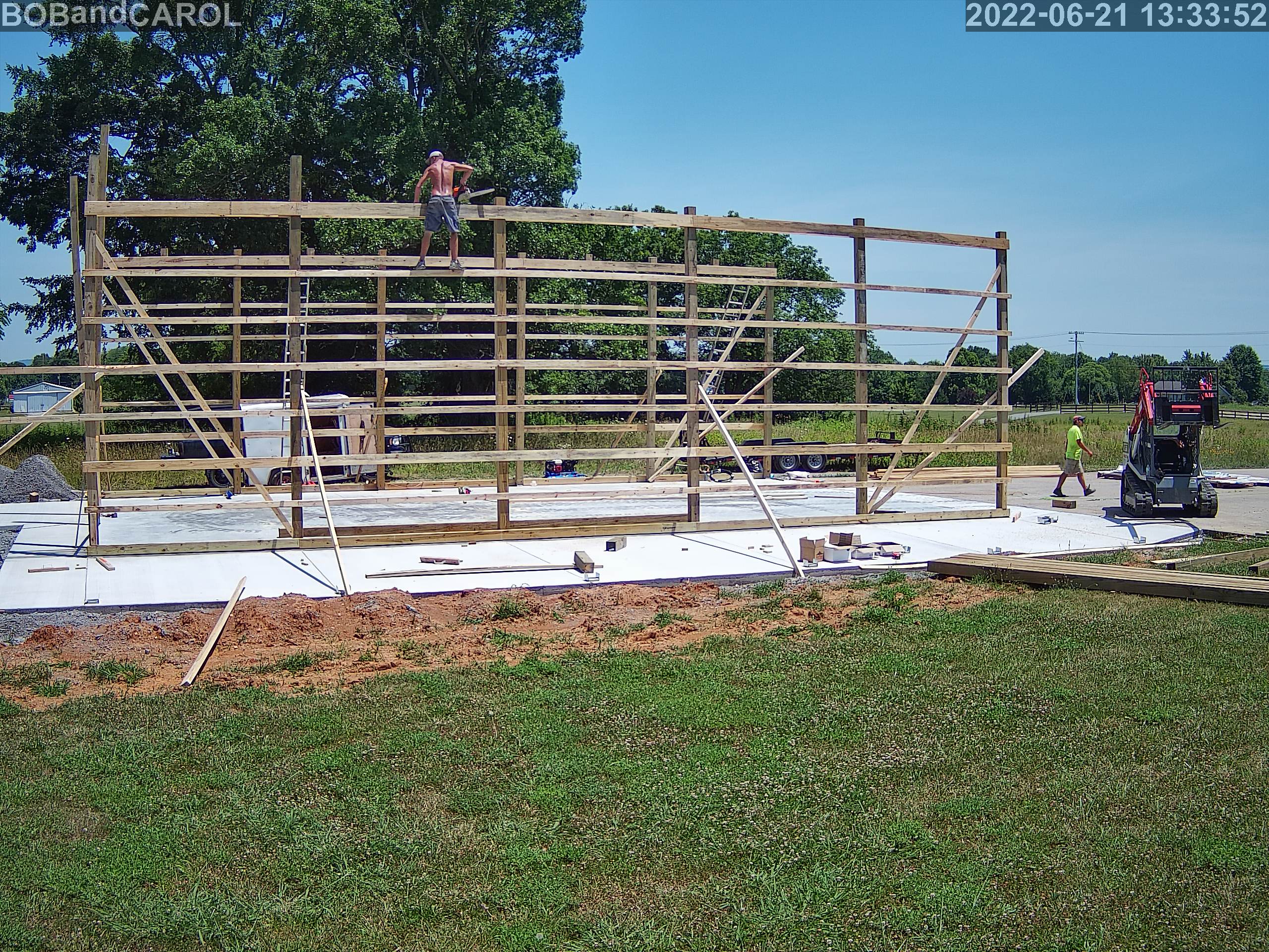 Primary building posts set, header boards, and side wall purlins installed.