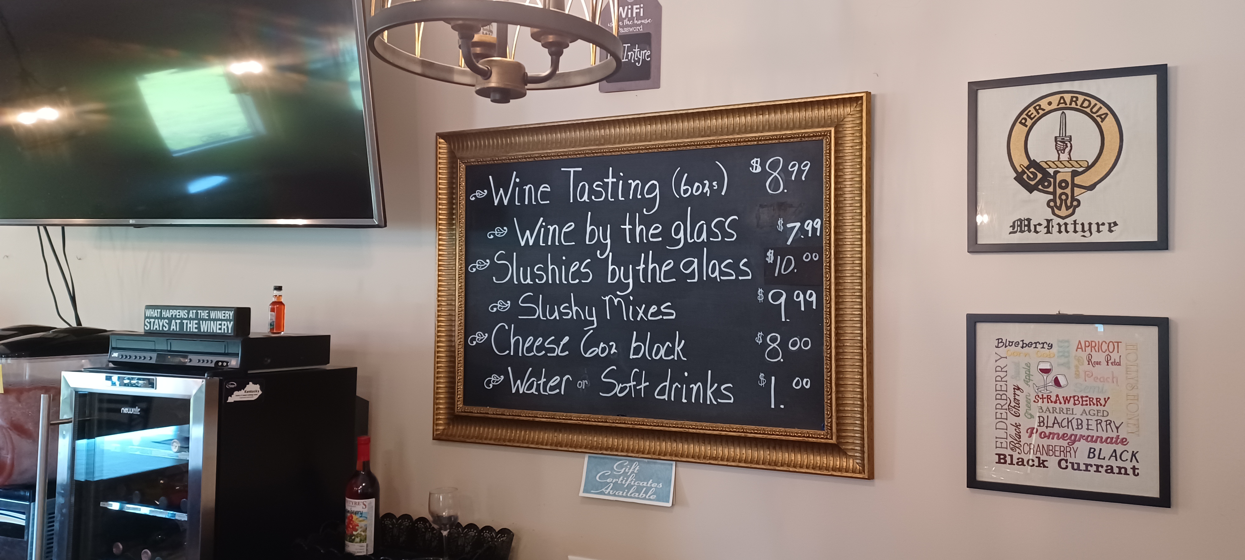 Wine tasting was very reasonable. $6-$10 for 6 options from a varied selection of dry - to sweet fruit wines.